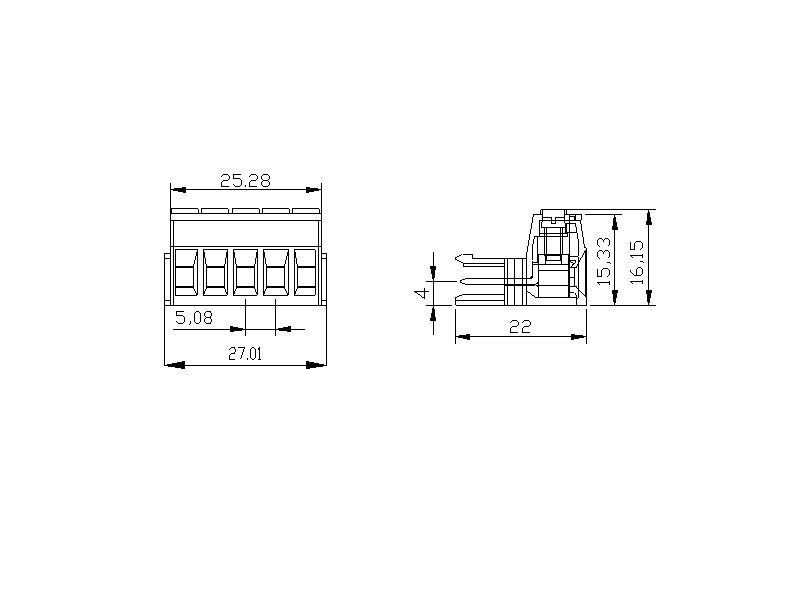 Asansör mekanizmalı vida bağlantılı soketli PCB klemensi5 kutupMax. iletken kesiti: 2,5mm²-14 AWGPim aralığı: 5,08mmNominal gerilim: 250VNominal akım: 16A