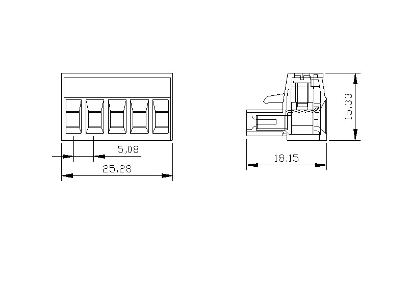 Asansör mekanizmalı vida bağlantılı soketli PCB klemensi5 kutupMax. iletken kesiti: 2,5mm²-14 AWGPim aralığı: 5,08mmNominal gerilim: 250VNominal akım: 16A
